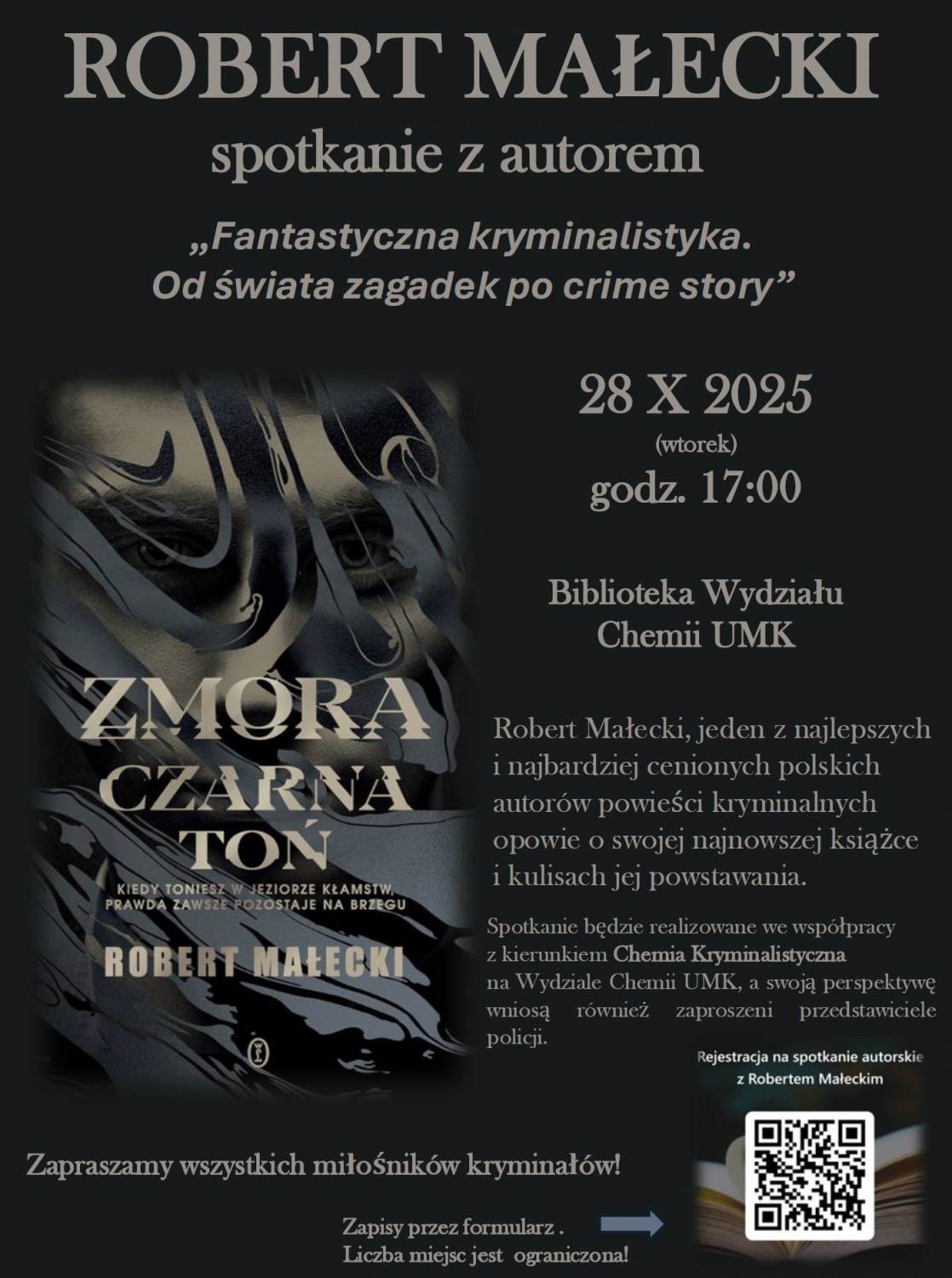 „Fantastyczna kryminalistyka. Od świata zagadek po crime story” to tytuł spotkania, które odbędzie się we wtorek 28.10.2025 roku, o godz. 17:00 w Bibliotece Wydziału Chemii.