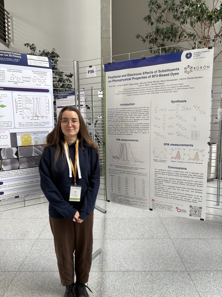 Anna Piec wzięła czynny udział w V Ogólnopolskim Sympozjum Chemii Bioorganicznej, Organicznej i Biomateriałów BioOrg w dniach 21-22 października 2025 r, gdzie zaprezentowała wyniki badań w formie posteru pt. „Zmiana wydajności kwantowej fluorescencji w związkach izomerycznych – nowe narzędzie w chemii barwników”.