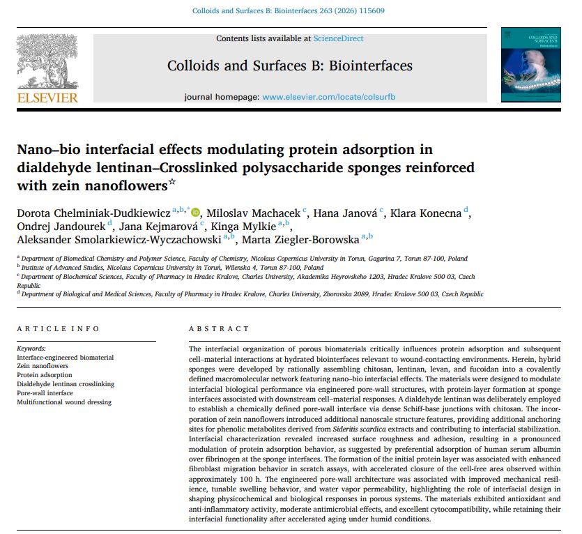 Jest nam miło poinformować, że w marcu 2026 r. ukazała się nowa publikacja naukowa w czasopiśmie Colloids and Surfaces B: Biointerfaces (Elsevier), pt.Nano–bio interfacial effects modulating protein adsorption in dialdehyde lentinan–crosslinked polysaccharide sponges reinforced with zein nanoflowers. Dostępna jest pod linkiem:https://doi.org/10.1016/j.colsurfb.2026.115609
