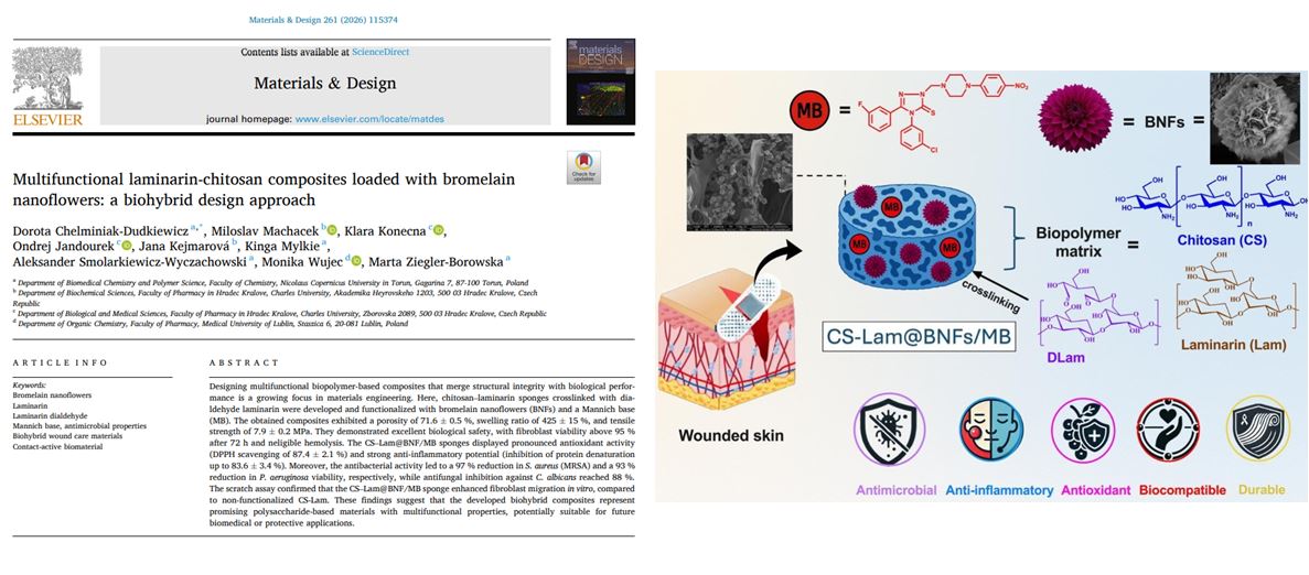 Z przyjemnością informujemy, że ukazała się nowa publikacja naukowa przygotowana przez członków naszego zespołu.Artykuł pt.Multifunctional laminarin-chitosan composites loaded with bromelain nanoflowers: a biohybrid design approach, dostępna jest pod linkiem:https://doi.org/10.1016/j.matdes.2025.115374. Zachęcamy do lektury!
